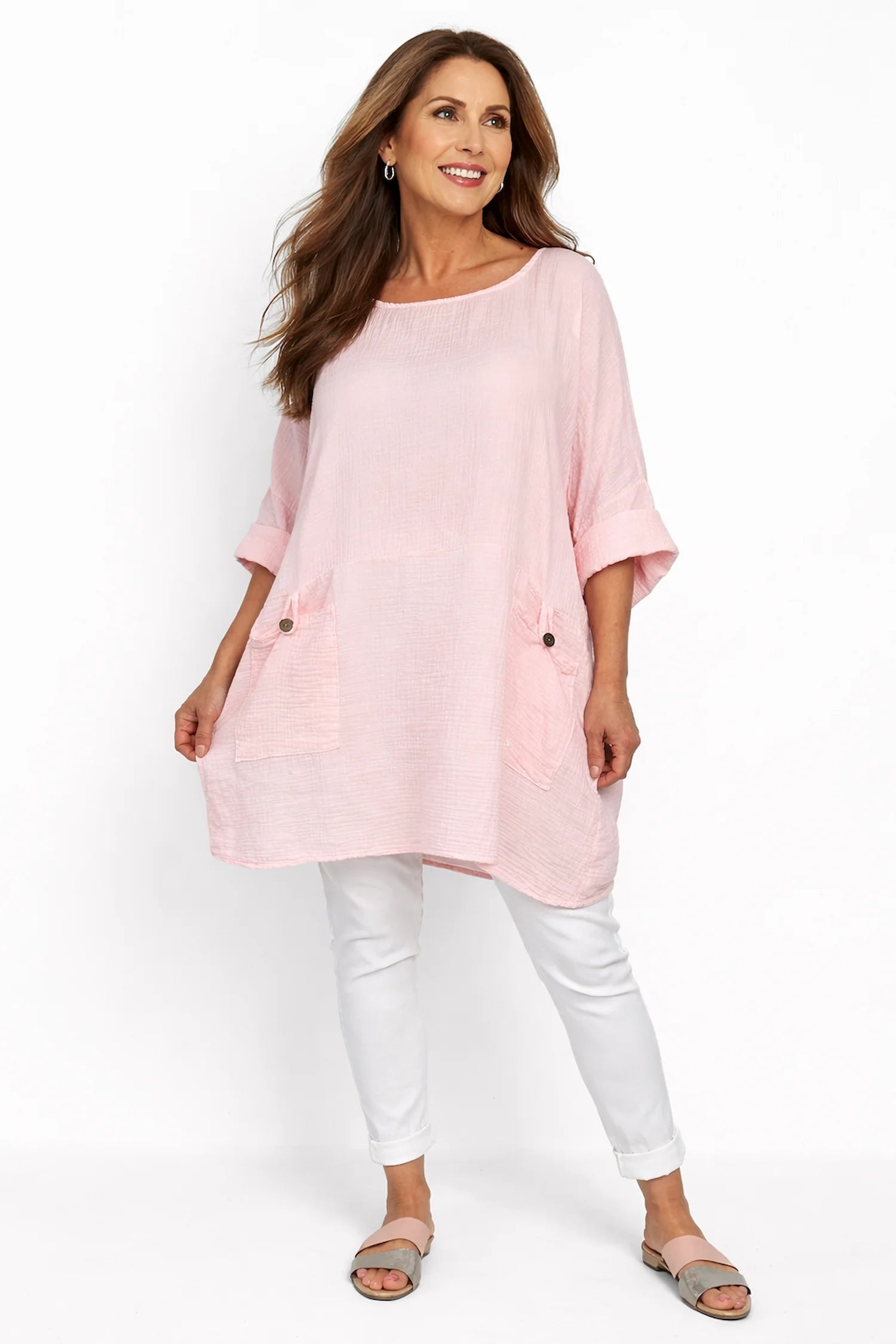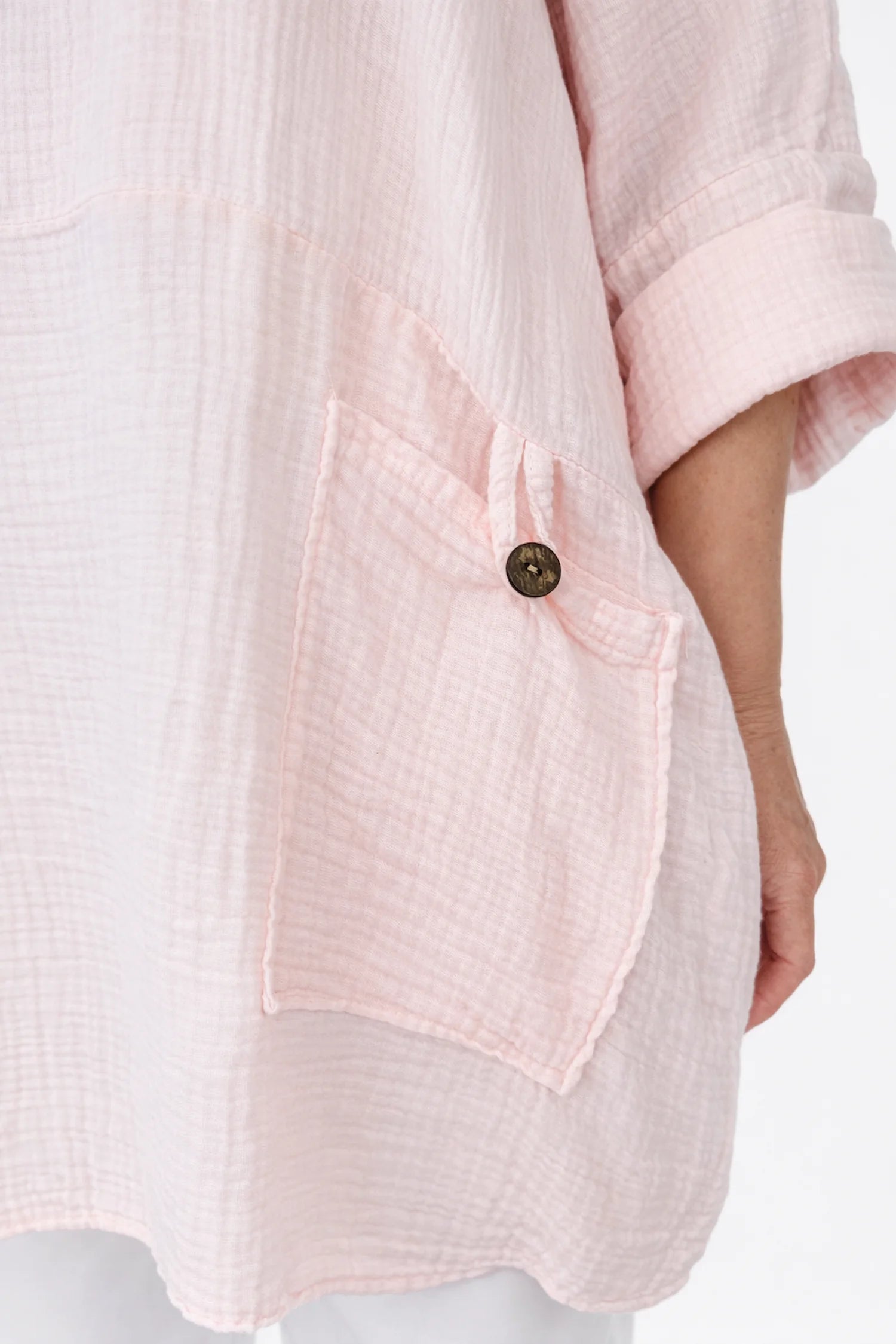 Bubble Cotton Double Button Pocket Tunic Top - Baby Pink