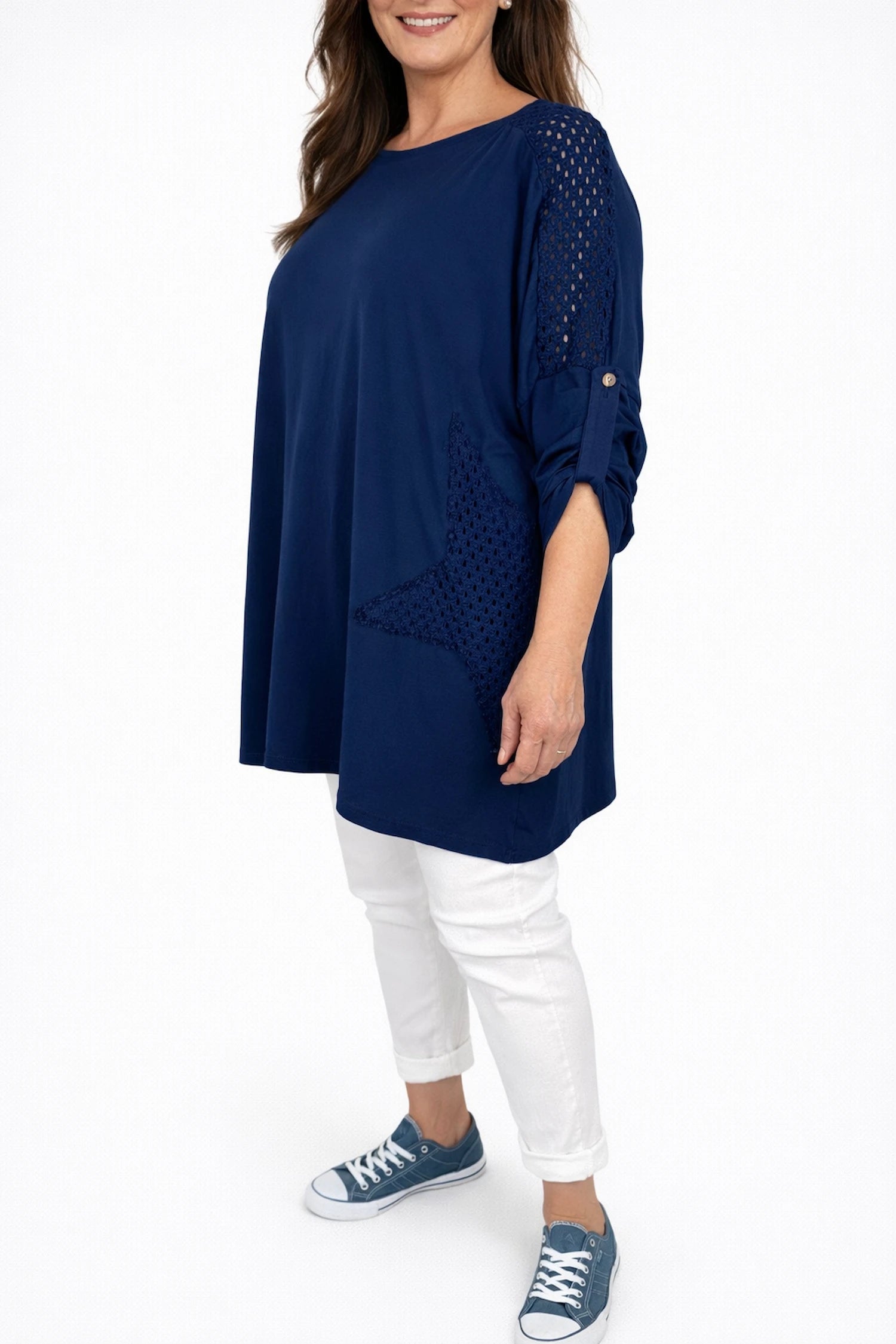 Cotton Crochet Detail Charmaine Button Sleeve Top - Navy