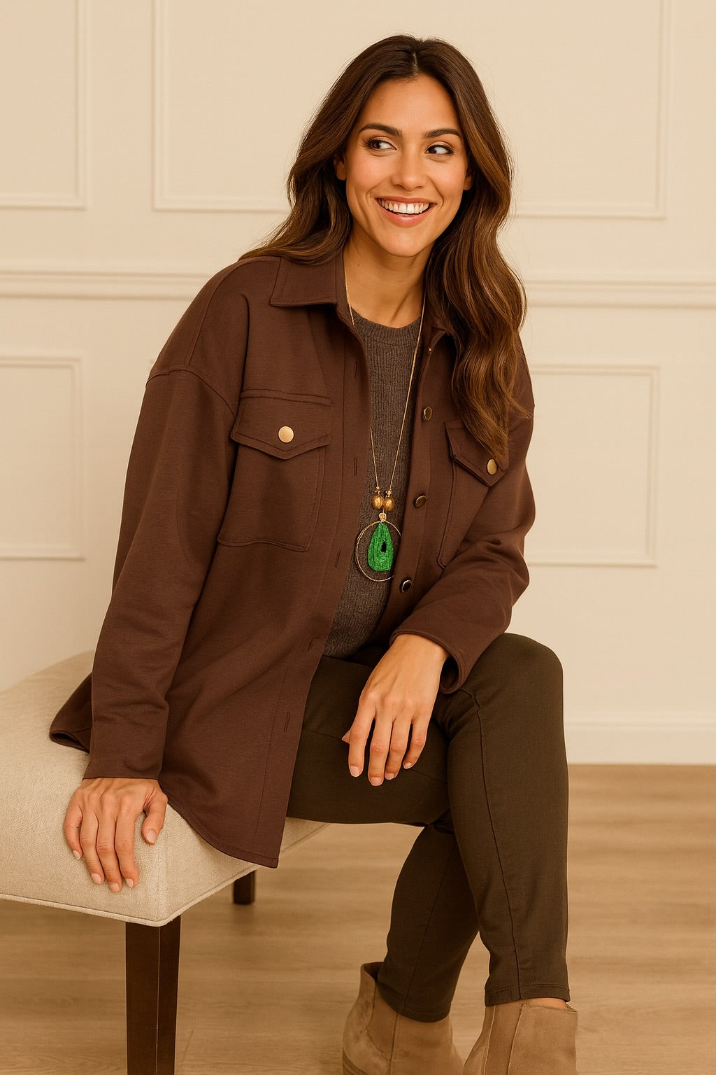 Premium Stitch Gold Button Double Pocket Verona Shacket - Chocolate