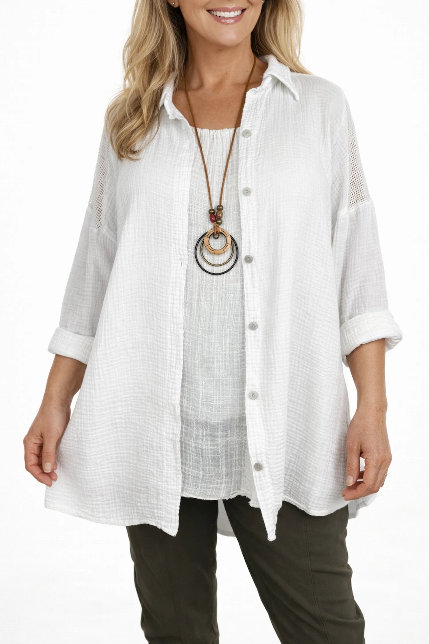Pure Bubble Cotton Mesh Sleeve/Back Detail Celeste Button Shirt - White